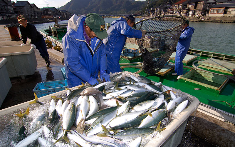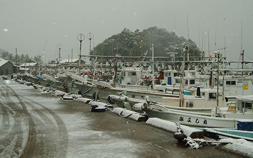 普段は人気のない穏やかな竹野漁港の朝。 水揚げの時は一変、様々な新鮮な魚介類が次々に水揚げされ活気がみなぎります。