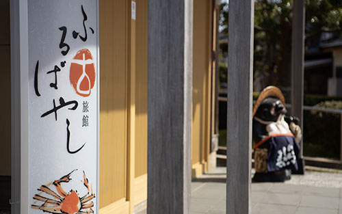JR竹野駅の目の前にある、旅館「ふるばやし」。純和風の外観は仕立てのいい田舎の蔵を思わせます。